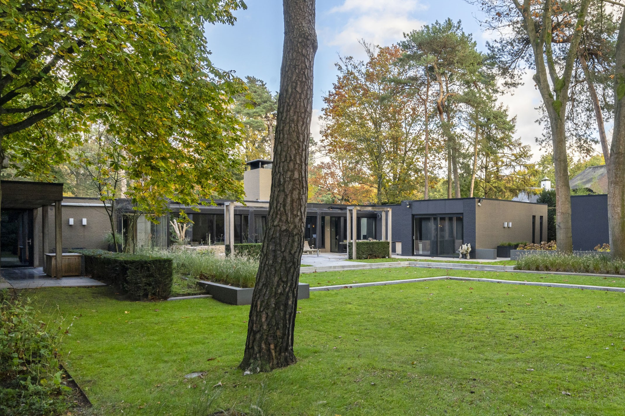En dan… de tuin! Onder architectuur van PUUR Groenprojecten is de tuin smaakvol verdeeld in verschillende vlakken met natuurstenen trappen en houten terrassen, voor een boeiend lijnenspel vanaf het zonneterras. Ook de privacy is uitermate goed; je hebt vanuit de tuin een prachtig uitzicht op het bos en kunt toch optimaal genieten van de zon. Een roestvrijstalen designpaal met schommel-ei voegt een speels accent toe. Achter in de tuin is nog een discreet opgestelde houten schuur met grote deuren, handig voor tuinmeubelen en gereedschap. Aan de achterzijde van de schuur is een overdekte ruimte waar het hout voor de open haarden droog kan wachten op de winter.
