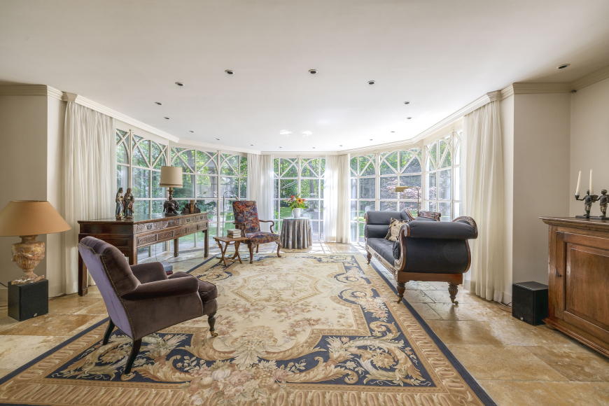 Aan de achterzijde van de living bevindt zich de tuinkamer, een lichte ruimte met ramen aan alle zijden, die een prachtig zicht geven op de tuin.