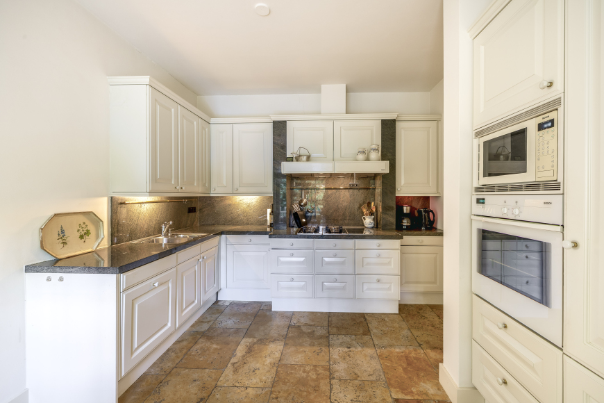 De keuken staat in open verbinding met de living en is opgesteld in een hoek- en wandopstelling. Deze is voorzien van een natuurstenen blad, voldoende opbergruimte in kasten en lades, en diverse inbouwapparaten. De aanwezige apparatuur bestaat uit: een 6-pits gasfornuis met een inductiegedeelte, een afzuigkap, een magnetron, oven en vaatwasser. Via een loopdeur in de keuken is de bijkeuken bereikbaar met daarin een vriezer en koelkast.