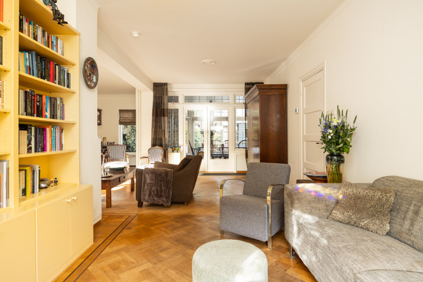 De woonkamer is een elegante, lichte ruimte met een klassieke erker met glas-in-lood en een groot toograam met roedeverdeling, beide met zicht op de voortuin en voorzien van een markies als zonwering. De houten mozaïekparketvloer met dubbele bies (2006), open haard en convectorputten zorgen voor stijl en comfort. De openslaande deuren geven de keuze tussen een open verbinding met de woonkeuken of juist twee afzonderlijke leefruimtes.
